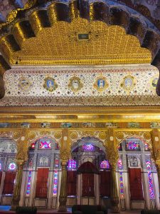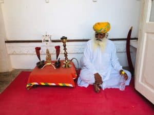 The majestic Mehrangarh Fort, built in 1460 by Rao Jodha, is a stunning example of asymmetrical and organic Rajput architecture combined with the elaborate geometry and floral decoration of the Mughals. Starting from the entrance, embellished with bullet marks, to the view of the blue city and the breathtaking architecture, the impregnable fort leaves you mesmerized. We took an audio-guided tour that takes the visitor on a veritable treasure hunt through the fort including a museum with magnificent collections of silver elephant howdahs, gilded palanquins, carved ivory, weapons inlaid with gold and jewels, rare pieces of textile, and some of the world’s finest miniature paintings. The Maharaja Gaj Singh II, who ascended to the Gaddi of Jodhpur in 1952 at the age of four, also shares his memories of the moving Raj Tilak Ceremony at Mehrangarh.