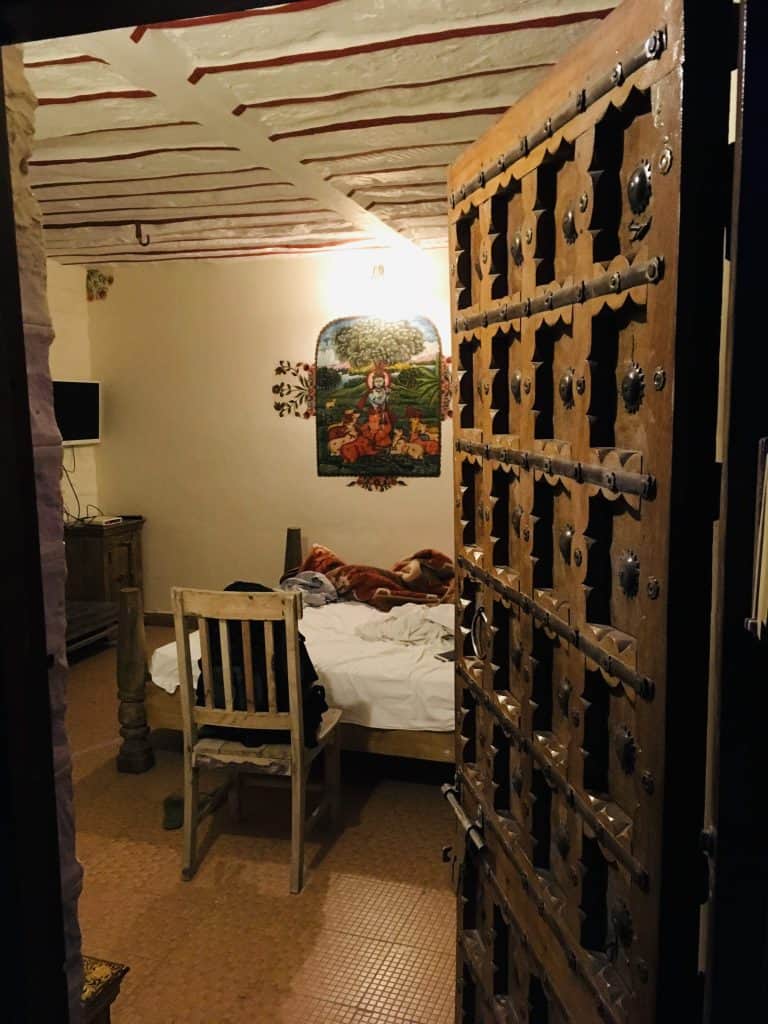 We had our reservation at this place called Hotel, The Blue House. I highly recommend staying at this beautifully built 500 years old, blue-colored house, located very close to the Mehrangarh Fort. The owner of the house greeted us with warmth and served hot and refreshing cinnamon tea. Parts of the house had been restored over time, but it still held a peculiarly attractive structure. The antique furniture was ornated with ancient showpieces of art and the walls decorated with murals exhibited the characteristics of the ancient era. Besides the extremely congenial and hospitable owners and mind-boggling interiors of the place, the highlight of the house was a rooftop café with a direct view of the Mehrangarh fort. We were lucky enough to get accommodation in two rooms with a private passage and view of the fort. This little corner of ours is what all of us cherish the most.