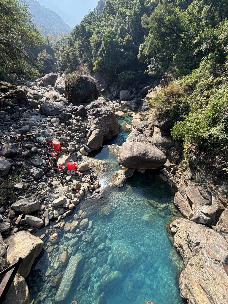 On our way back from the Double Decker Living Root Bridge, we took a refreshing detour to the Blue Lagoon, nestled just below the iron suspension bridge. The moment we arrived, we were spellbound—the crystal-clear blue waters looked almost unreal, untouched by filters or edits, a true natural wonder.