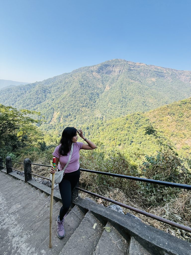 The trek to the Double Decker Root Bridge in Nongriat is both challenging and rewarding, starting with a steep descent of about 3,500 steps. Along the way, small shops sell snacks and bamboo walking sticks (Rs20 each). Though I’m not a fan of trekking poles, I decided to get one, anticipating its usefulness during the return climb. Local boys offered to guide us, but the path is clearly marked, making a guide unnecessary.